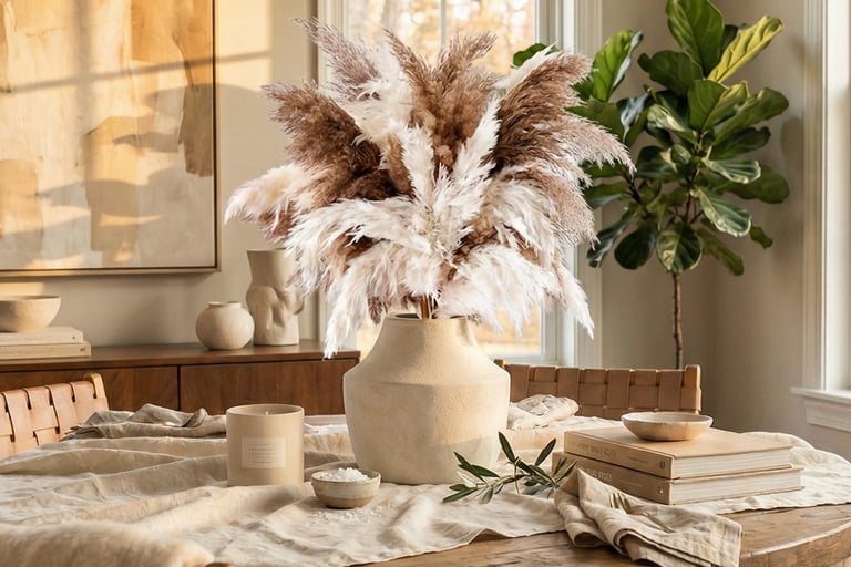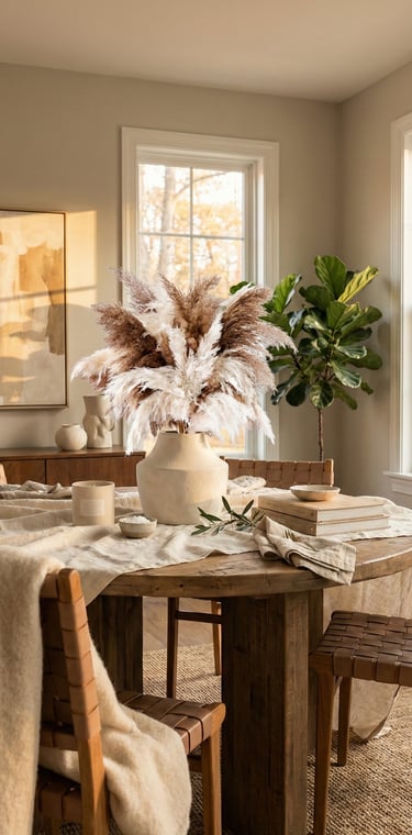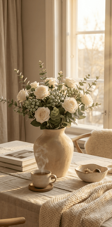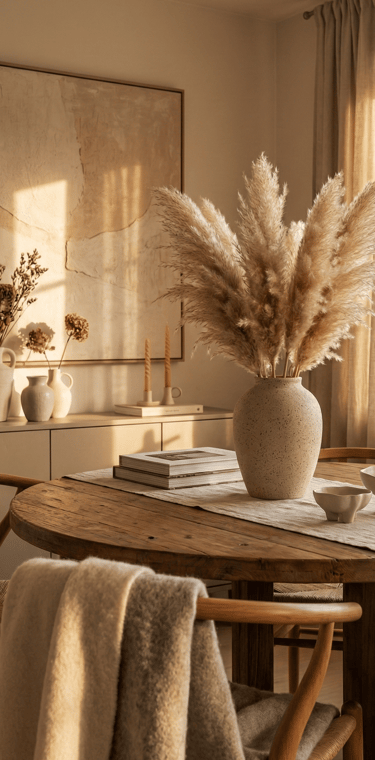 Keep the table beautifully simple with one soft statement piece that brings warmth to the room. A neutral ceramic vase paired with a few elegant faux stems adds height and softness without cluttering the space. It’s an easy way to make your dining area feel intentionally styled every single day.