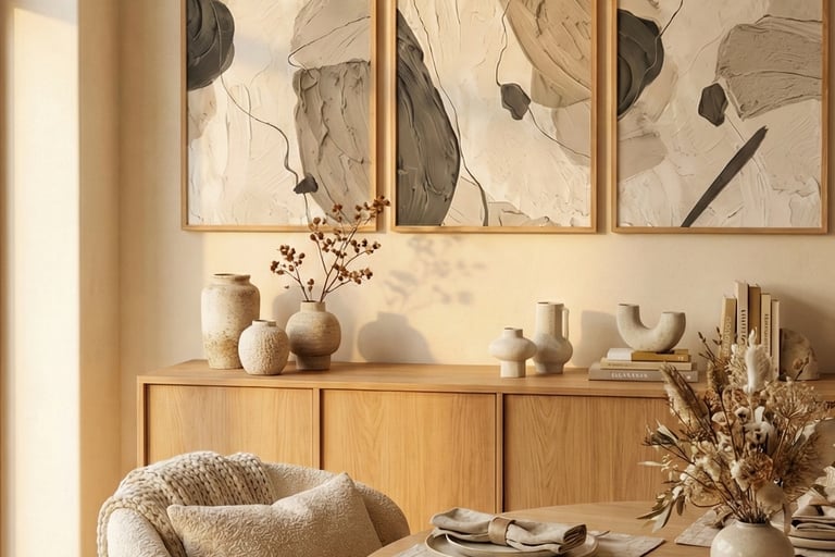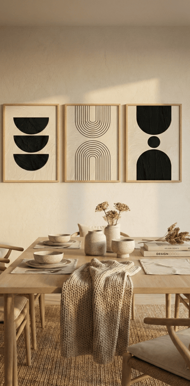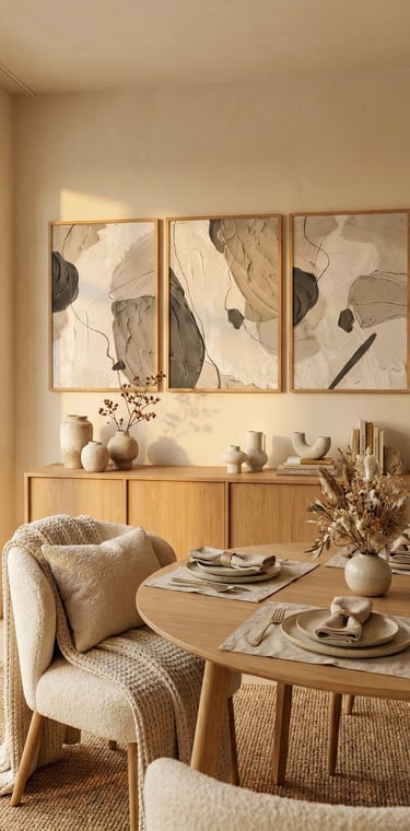 Art sets the tone for the entire dining room. Go for soft abstract prints in light oak frames to keep the space airy and elegant. It adds personality while staying beautifully minimal — refined, not loud.