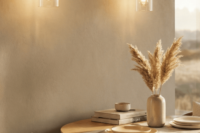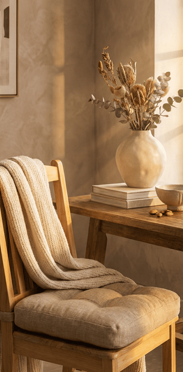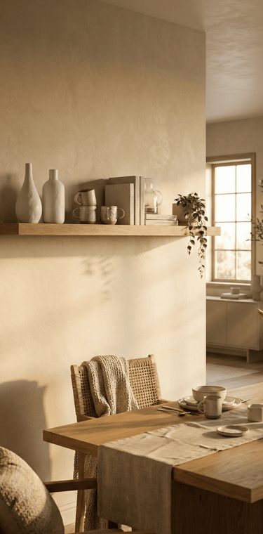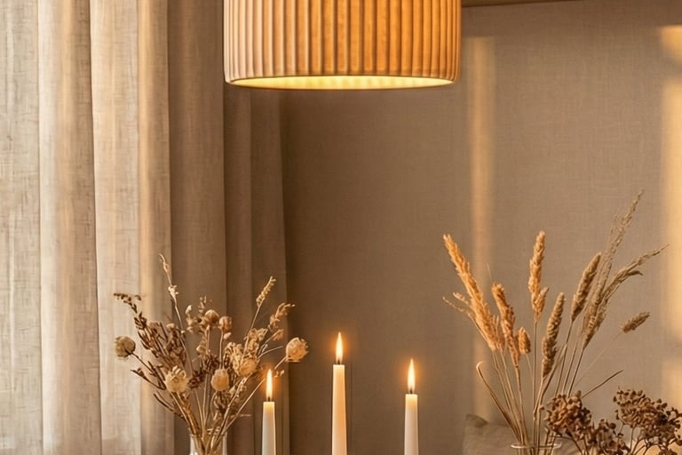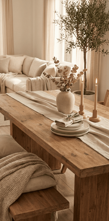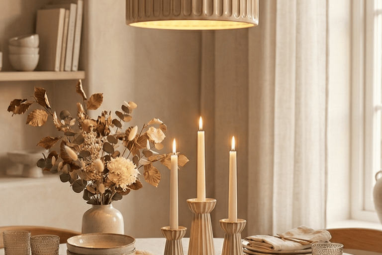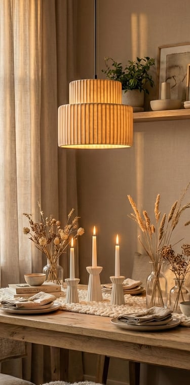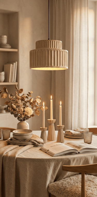 Lighting changes everything. A warm-glow pendant light above the table creates a cozy and elevated feel — perfect for relaxed dinners and slow mornings. Pair it with taper candles in soft, neutral holders to add depth and a gentle, welcoming atmosphere every day.