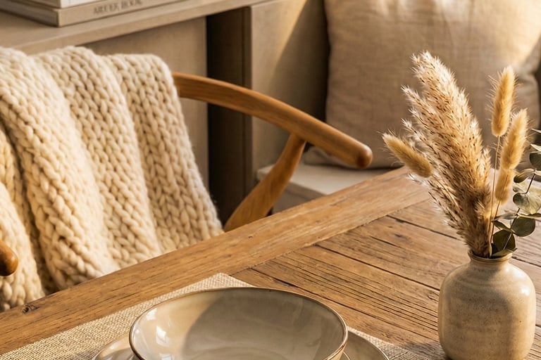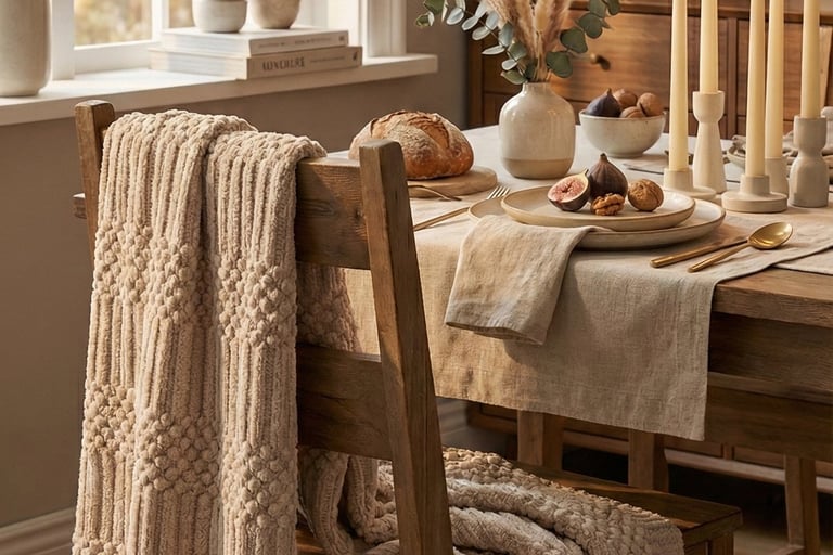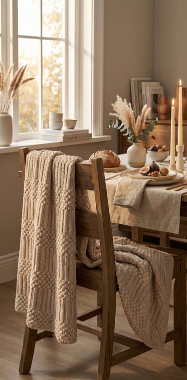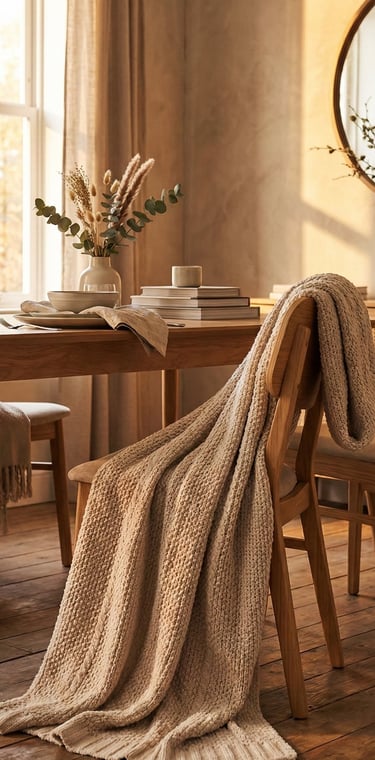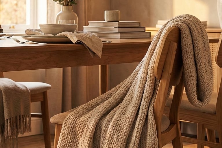 Keep dining cozy with lightweight throws draped over chairs. They add warmth and comfort, while giving the room that relaxed, Scandinavian living vibe — like a long dinner in a Nordic cottage.