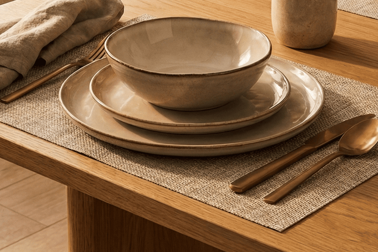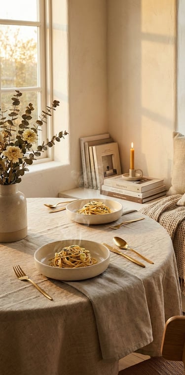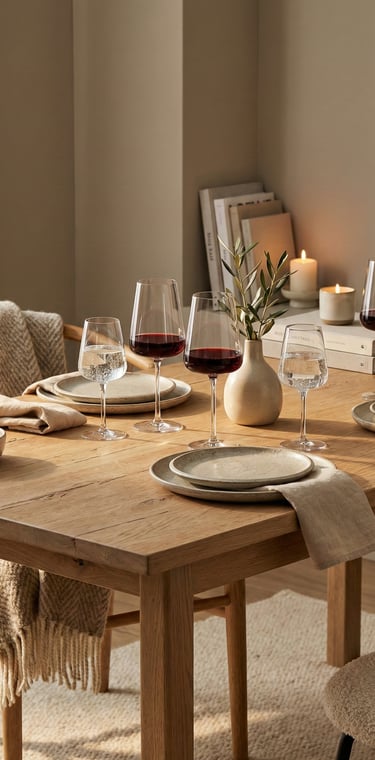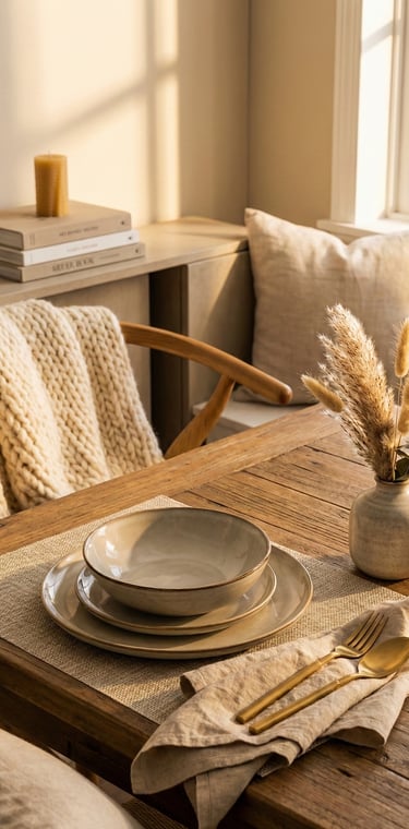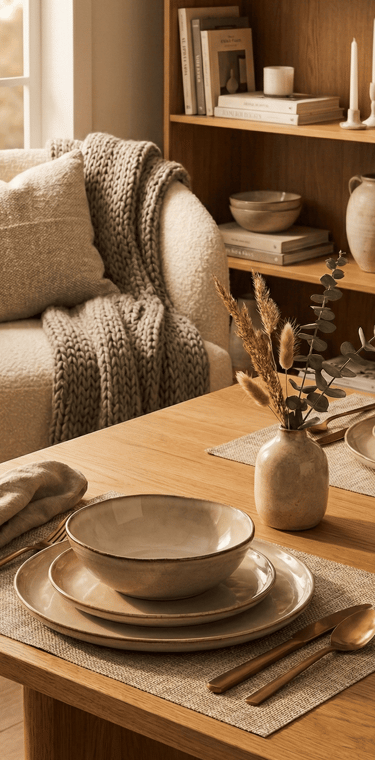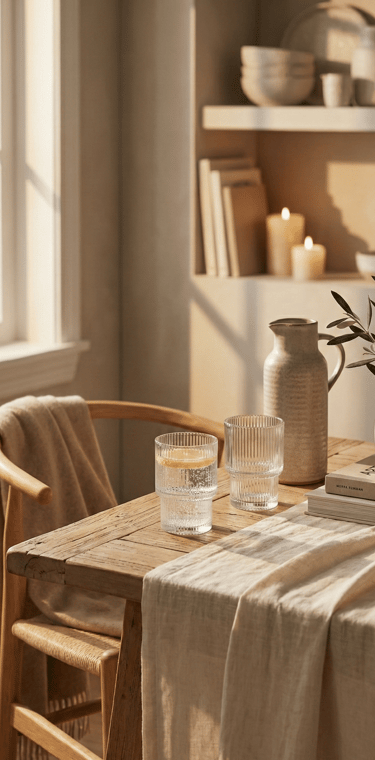 Make everyday meals feel special with soft linen placemats and neutral stoneware plates. Natural textures instantly elevate the table, while keeping the vibe relaxed and Scandinavian. It’s effortless elegance — no holiday required.