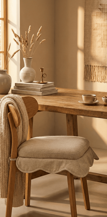 Dining chairs don’t need to look or feel strict. Add scalloped seat cushions or linen chair pads to make the space softer, more inviting, and comfortable enough for long dinners and card games that drift into the night.