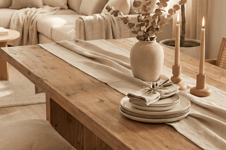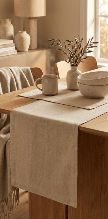 A neutral linen table runner brings quiet softness to your dining table. It creates a warm foundation for your meals while making the space feel styled — even when you’re only serving take-out.