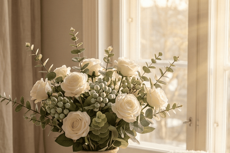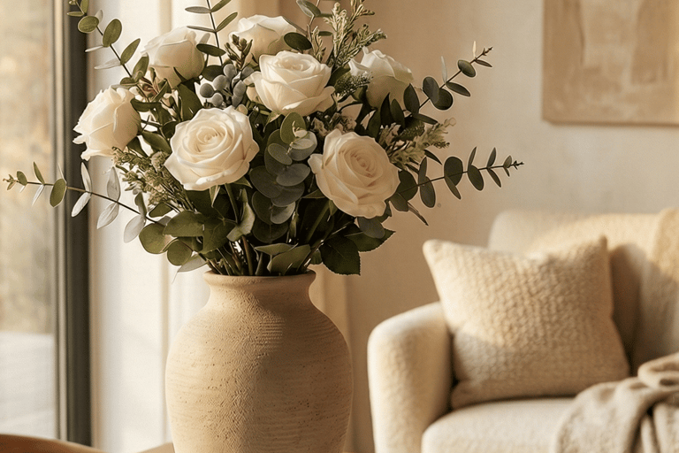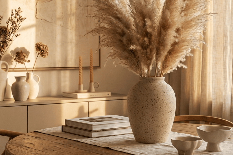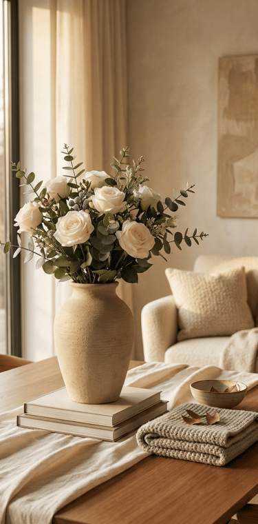 One beautiful sculptural vase can become the entire room’s centerpiece. It feels intentional, artistic, and elegant — especially when paired with a few minimal branches or dried stems.
