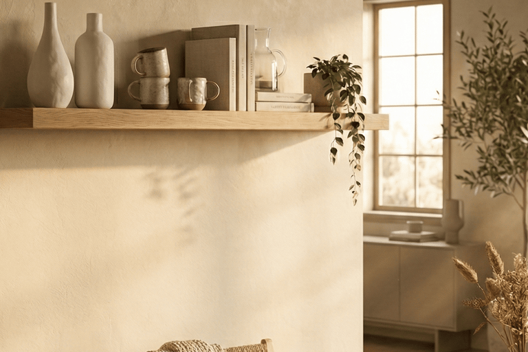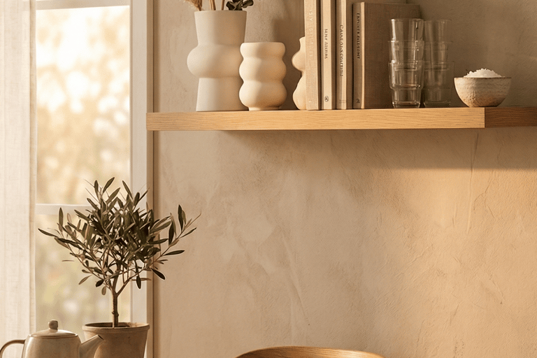Instead of hiding everything away, showcase pieces you love. A minimal wood wall shelf lets ceramics, pretty glasses, and cookbooks become part of the decor. It adds character and warmth without clutter — curated, not crowded.