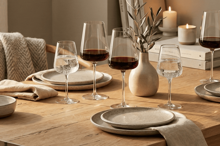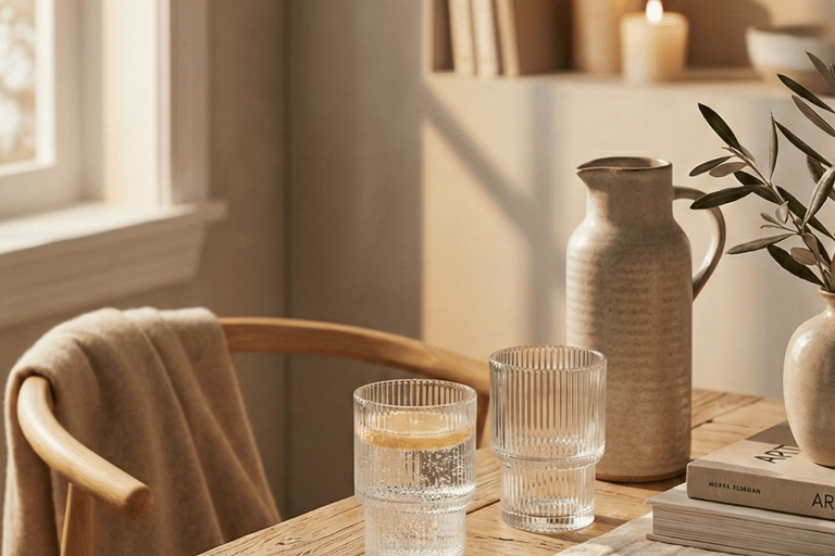 Even water feels luxurious in the right glass. Neutral textured drinking glasses or subtly designed wine glasses add shine and elevate everyday rituals. Small upgrades that spark a “this feels nice” moment at home.