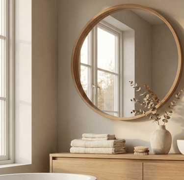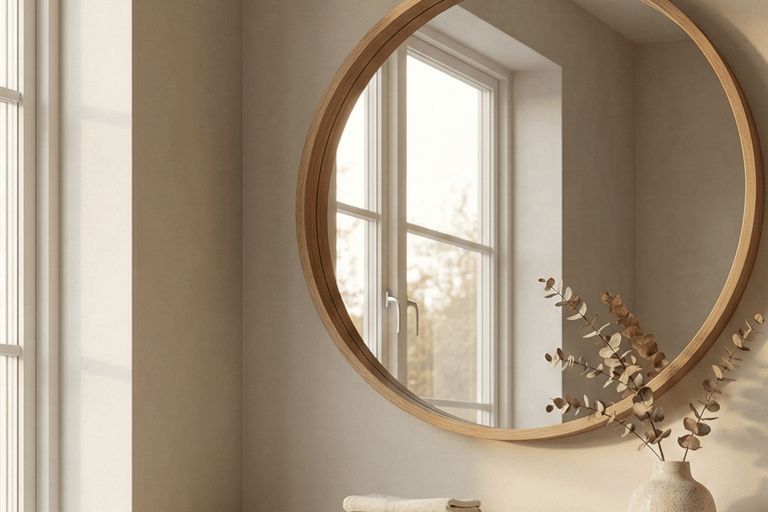 A round wall mirror bounces light and creates a more spacious feel. Warm metal or wood frames add softness and turn a practical piece into decor.