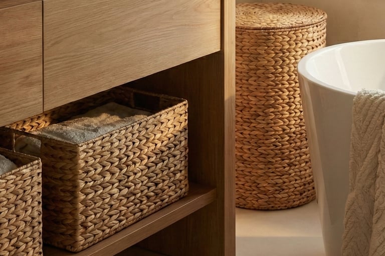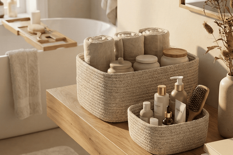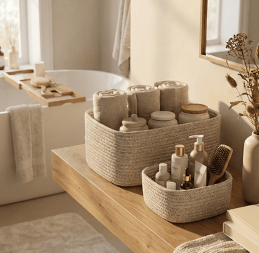 Clutter makes a small bathroom feel even smaller. Use neutral fabric baskets to hide skincare and hair tools — everything stays close, but not visible.