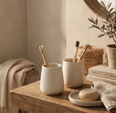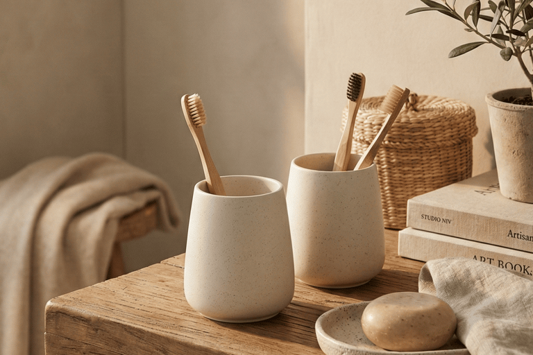 Swap plastic cups for a ceramic toothbrush holder that adds soft elegance to the sink area. Small changes, big impact on the overall look.