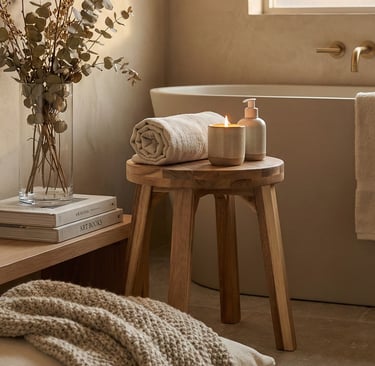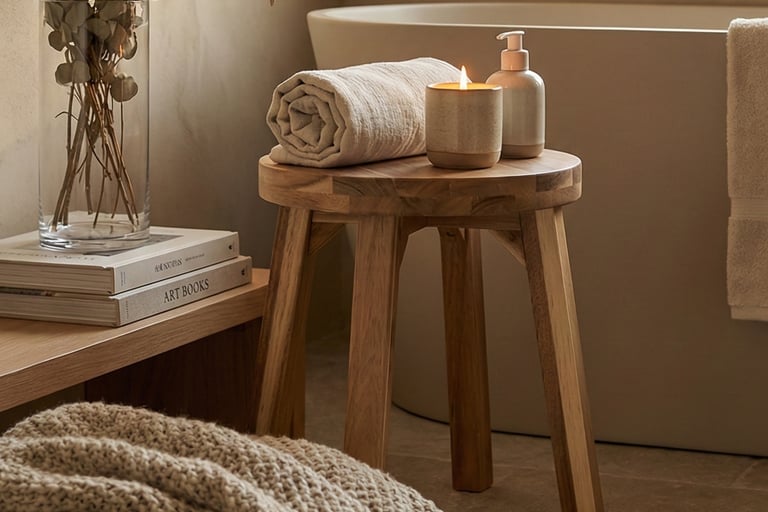 A compact wooden stool offers multiple uses — a place for towels, a candle, or to rest while applying lotion. It creates a calming, styled spa moment.