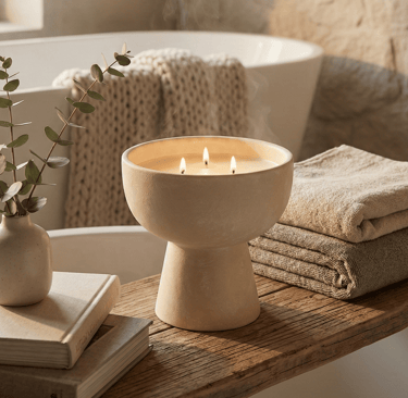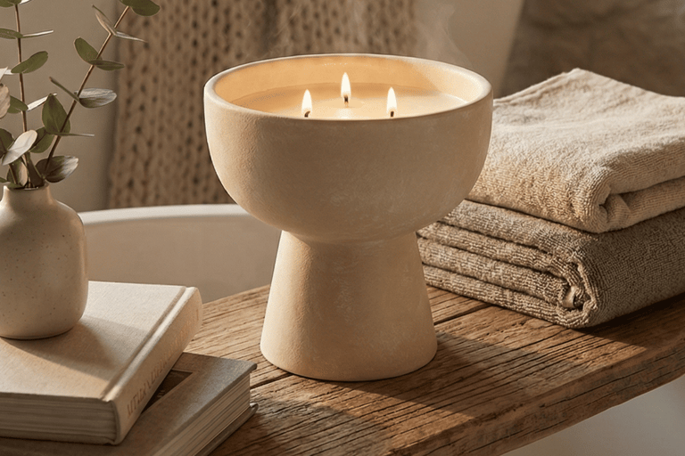 A softly glowing soothing scented candle brings peace into the space — the quickest way to make a bathroom feel like a spa.