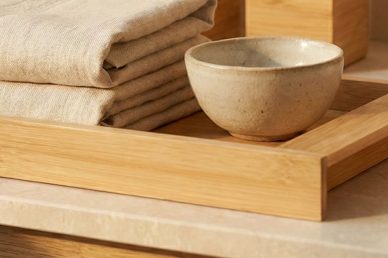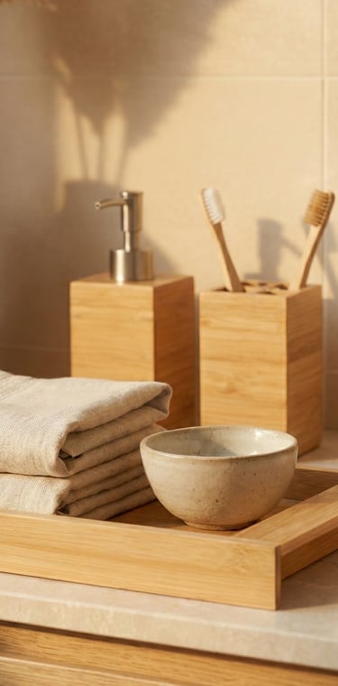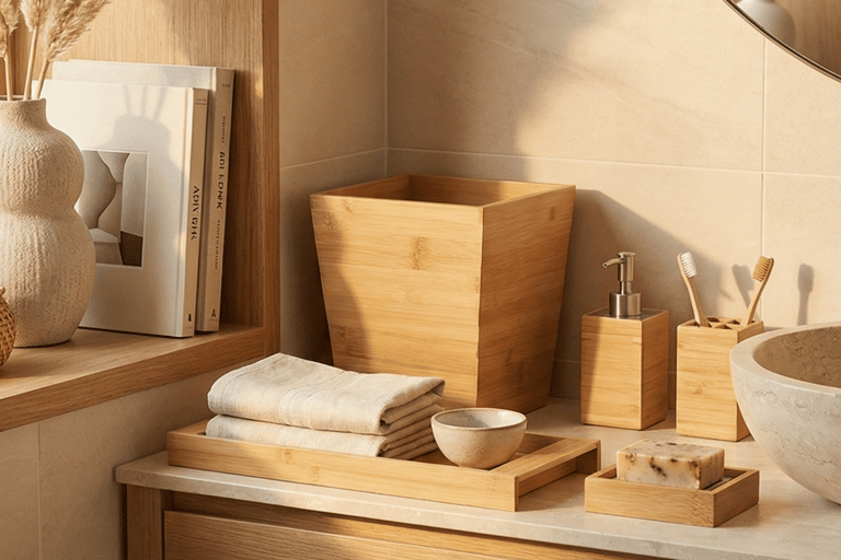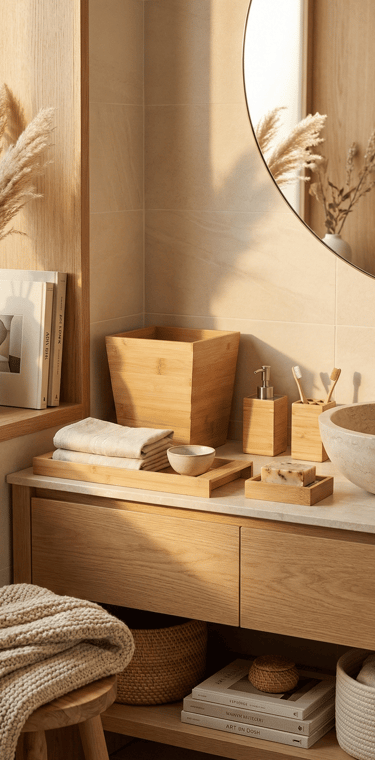 Swap plastic out for bamboo accessories to add warmth and organic softness. Small natural touches make the bathroom feel more serene and intentional.