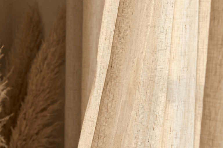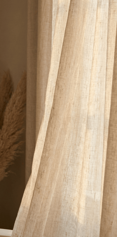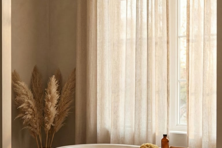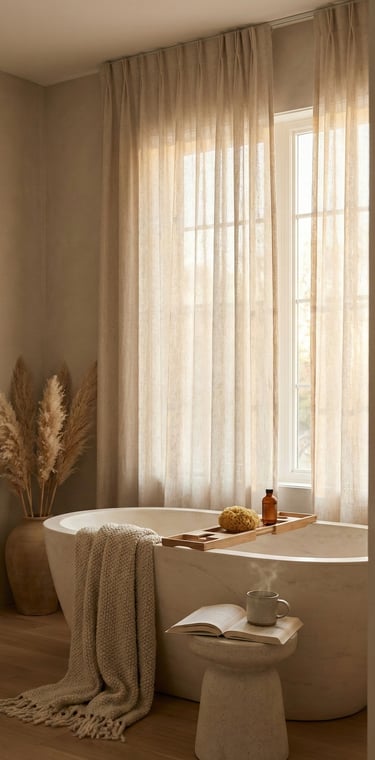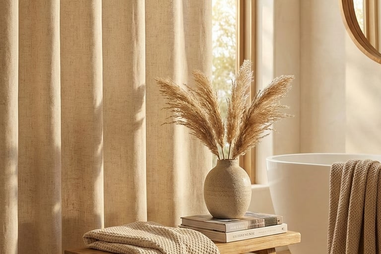A neutral linen-look shower curtain adds gentle texture and warmth, making even a small bathroom feel more inviting and less sterile.