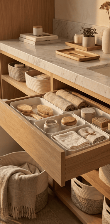 Hide the everyday chaos with woven storage baskets and neutral drawer organizers. When surfaces are clear, the mind can relax.