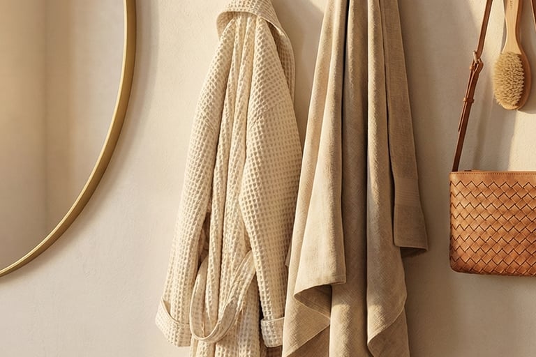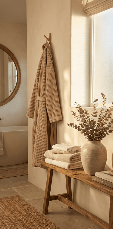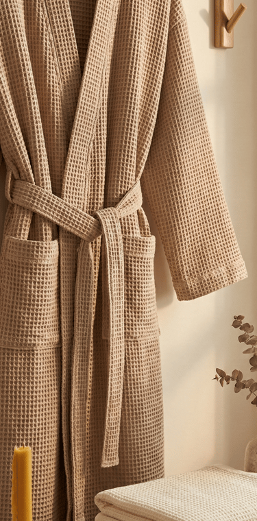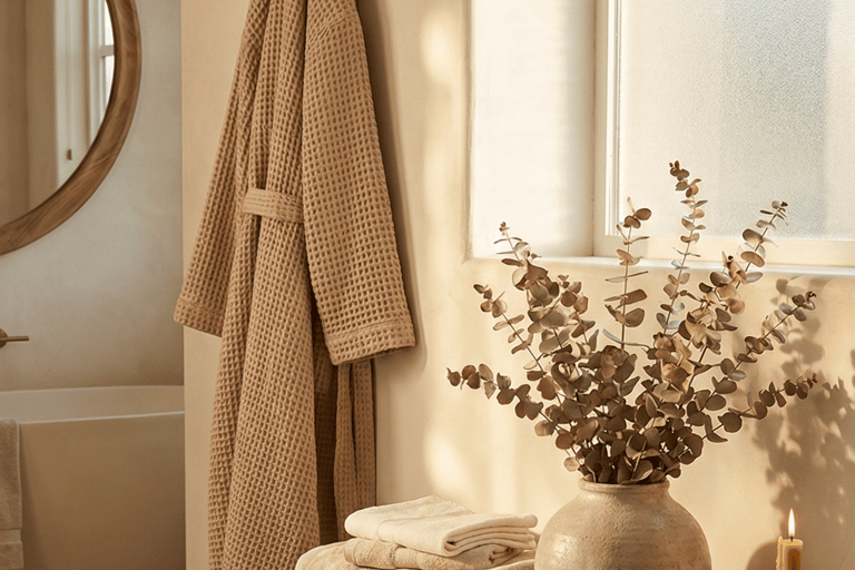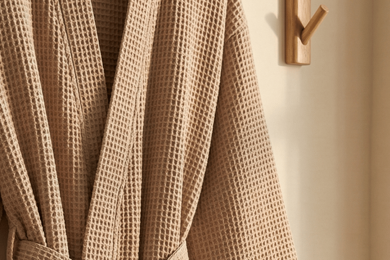 A waffle robe hanging on a hook adds warmth and a spa-like feeling, while staying practical for everyday comfort.
