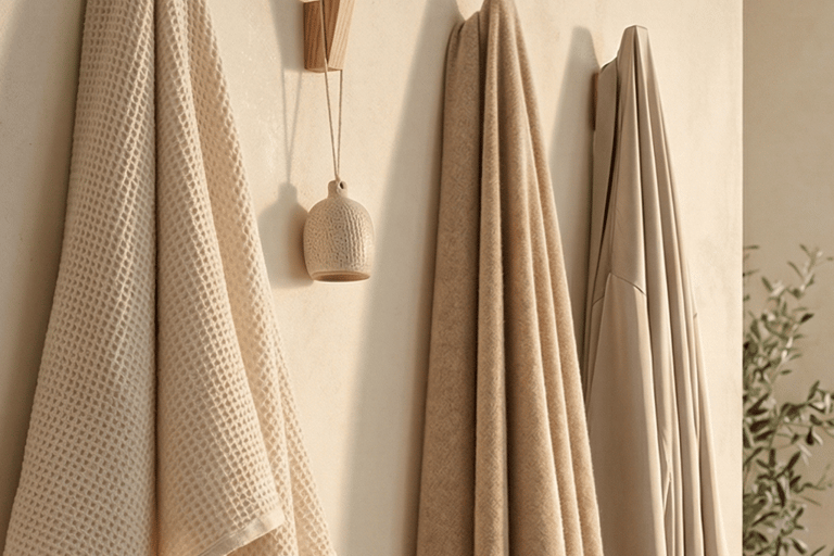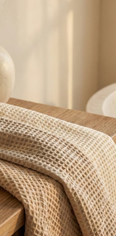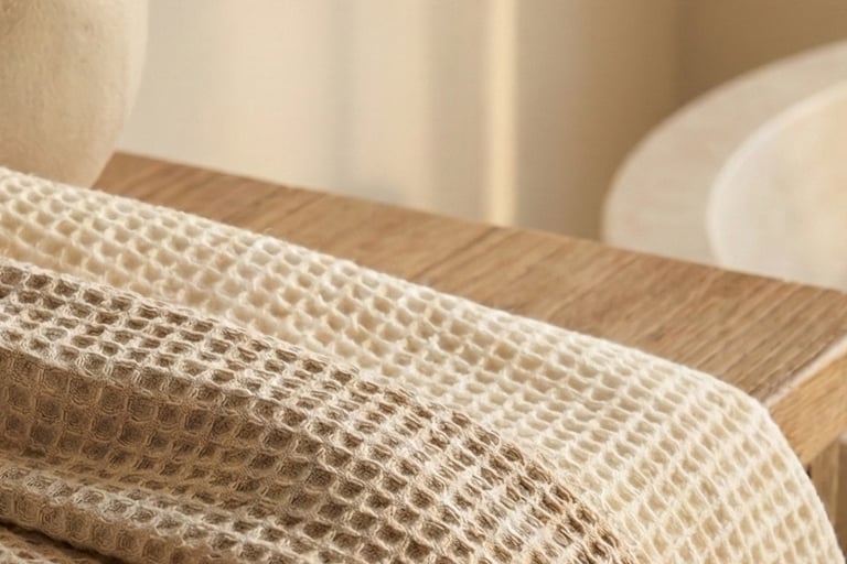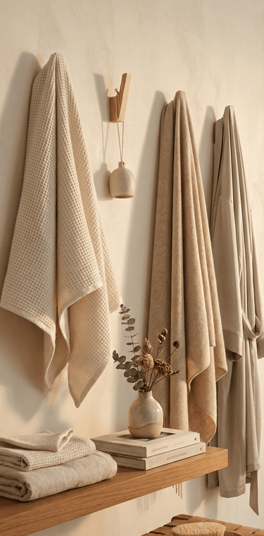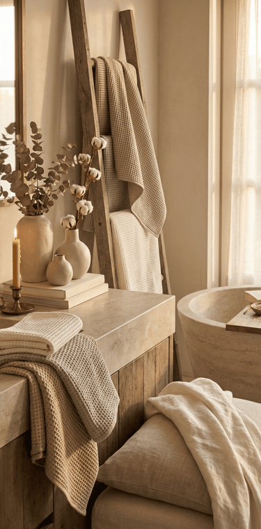 Upgrade the feeling of your bathroom with thick, waffle-textured towels in warm neutral tones. They add softness, absorbency, and that quiet spa elegance you feel the moment you step out of the shower.