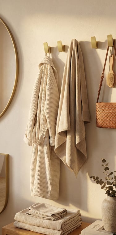 Use brushed brass or wood hooks to keep towels and robes organized without bulky hardware. It keeps the room visually light and beautifully minimal.