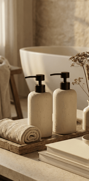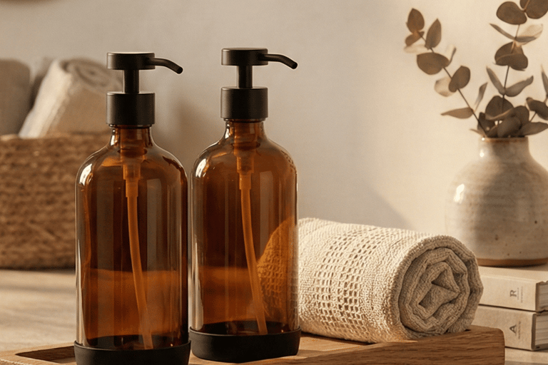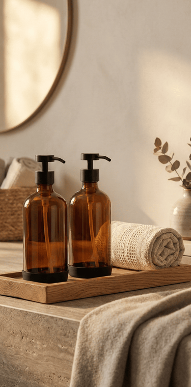 Replace branded bottles with amber or frosted refill dispensers to create a visually calm countertop. It’s an easy upgrade with a big impact on the bathroom’s feel.