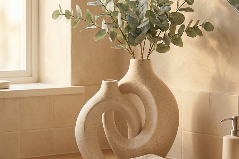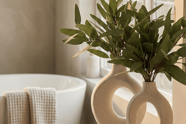 Even a small touch of nature changes everything. A faux eucalyptus stem in a soft ceramic vase adds vitality and balance without overwhelming the minimal aesthetic.