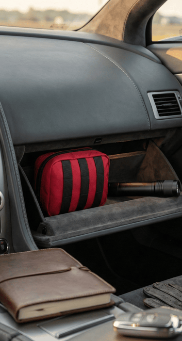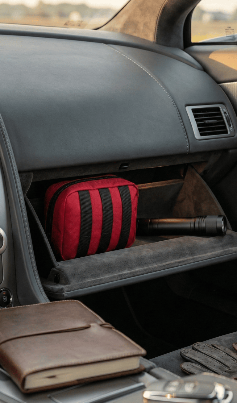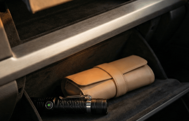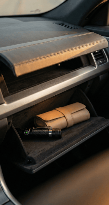 Practical items don’t need to look utilitarian. A compact rechargeable flashlight stored in the glove box offers reassurance without visual compromise. When combined with a clean emergency pouch, it ensures you’re prepared while maintaining the same understated aesthetic found throughout the rest of the car.
