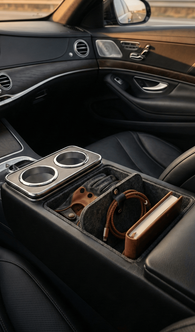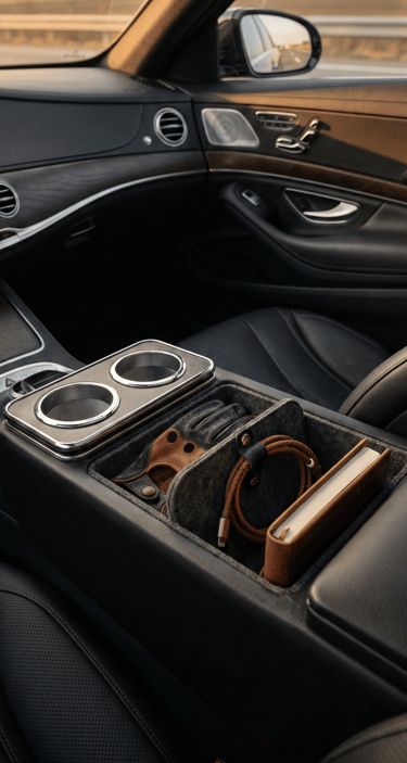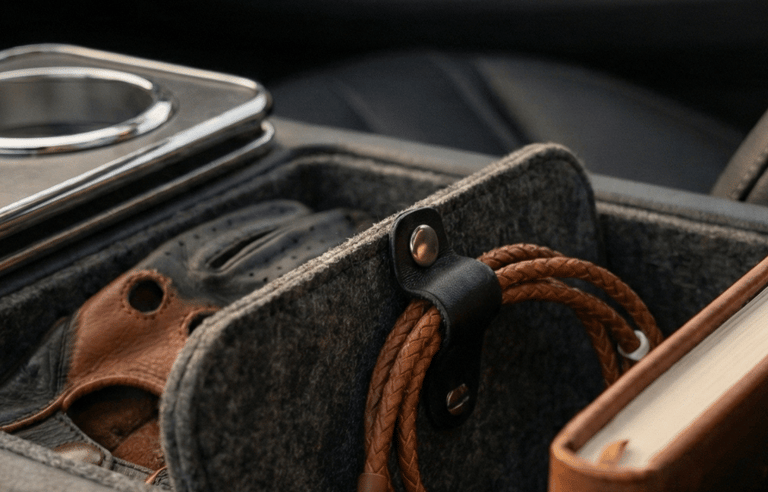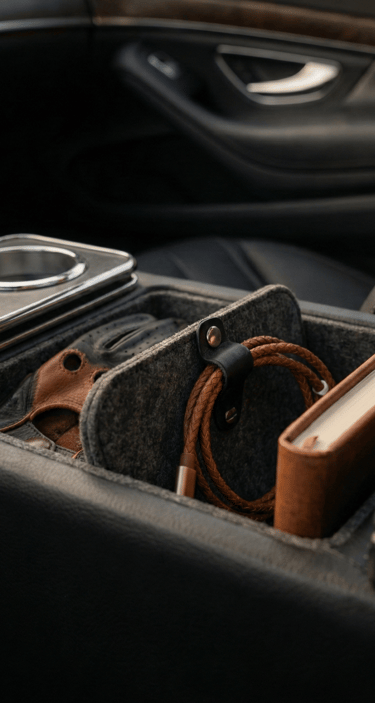 Loose items in the center console quickly break the visual flow of an interior. A car console organizer, especially one made from felt or leather, keeps everyday essentials neatly separated without looking technical or bulky. When combined with a minimal cable holder, the entire cabin feels calmer, more intentional, and easier to enjoy — especially during longer drives.