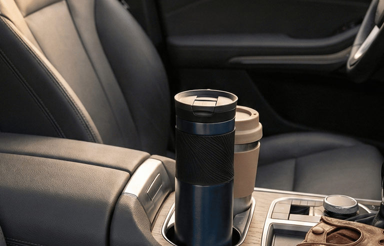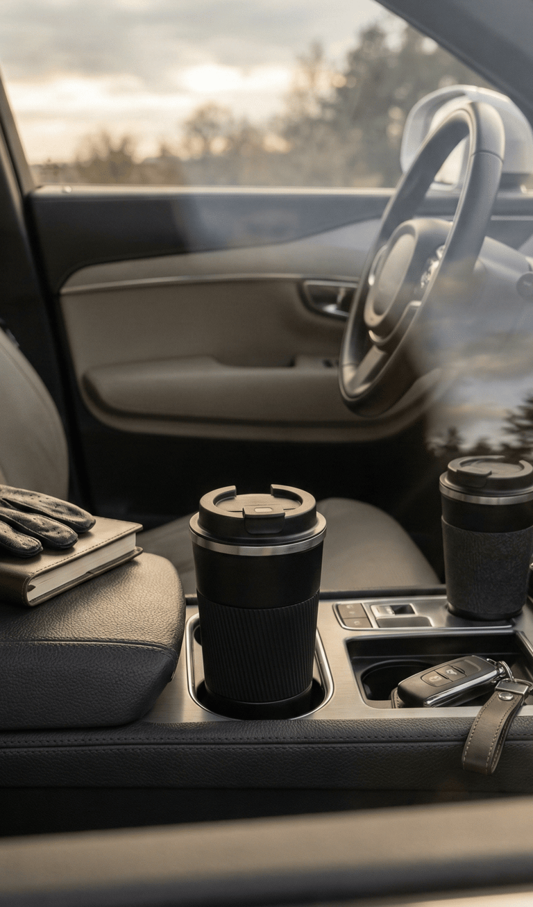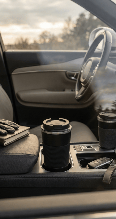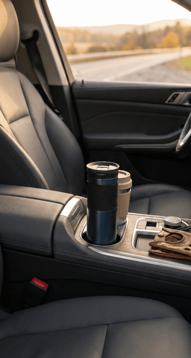 Some items naturally photograph well. A minimalist thermos mug placed in the cup holder or center console becomes part of the visual story — functional, balanced, and aesthetically pleasing. When paired with a matching travel cup lid or sleeve, it feels considered rather than accidental.