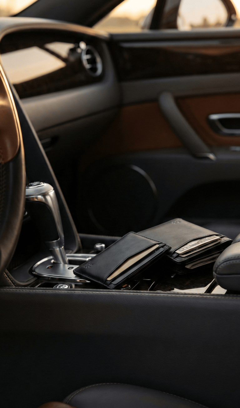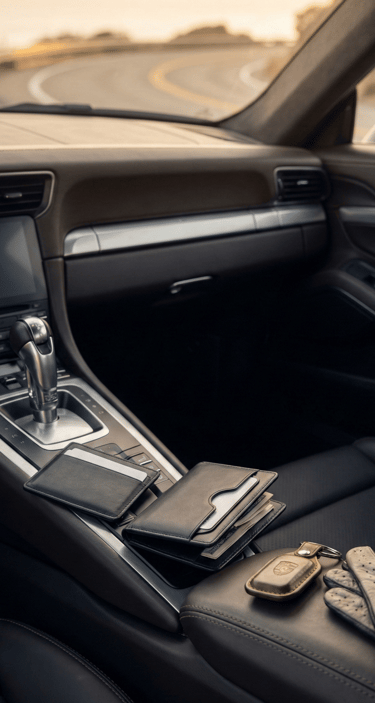 What you carry with you during a drive becomes part of the experience. A slim leather wallet or compact leather pouch fits naturally into the car lifestyle — easy to store, easy to reach, and visually calm. Paired with a minimalist card holder, it reinforces a sense of readiness without unnecessary bulk.