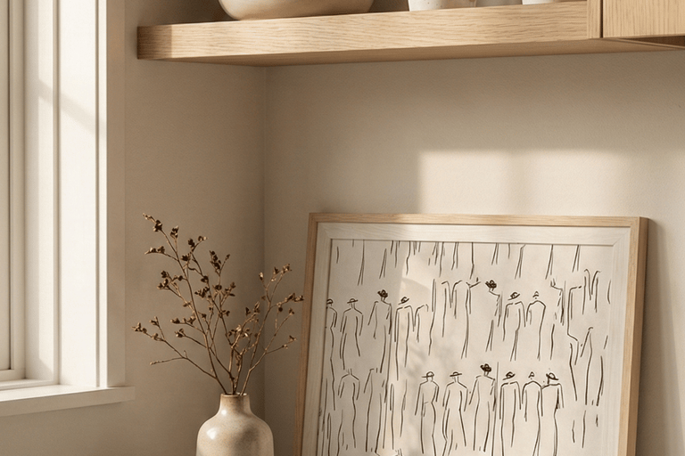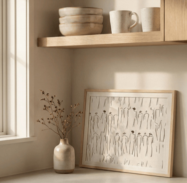 A few bowls, a framed print, and neutral ceramics — perfectly simple.