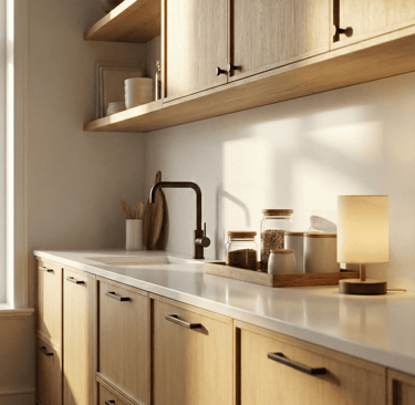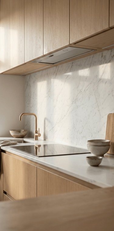 Light wood instantly warms up a kitchen and makes it feel inviting. Pairing it with smooth white countertops creates the perfect Scandinavian balance.