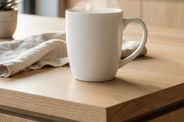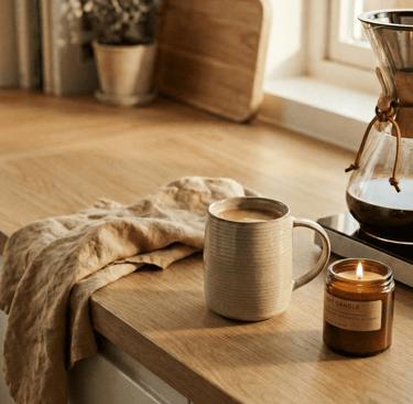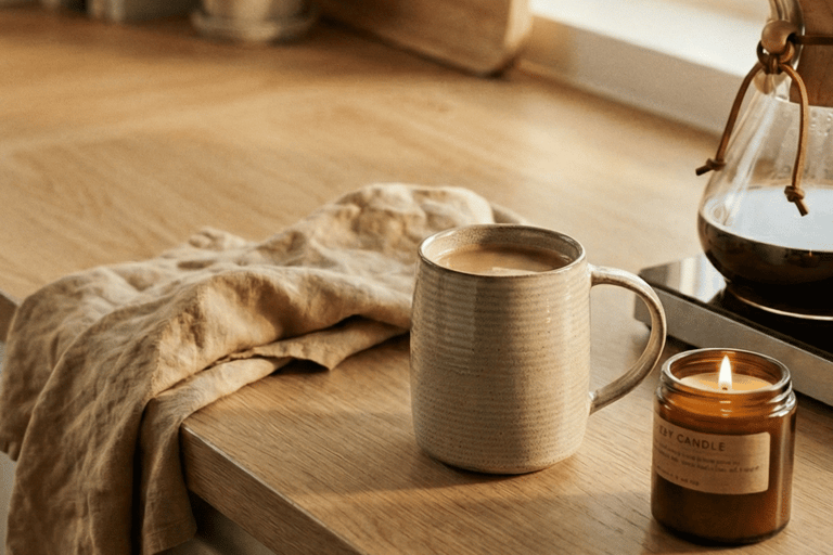 A mug, a candle, and a warm linen cloth instantly create a comforting morning ritual vibe.