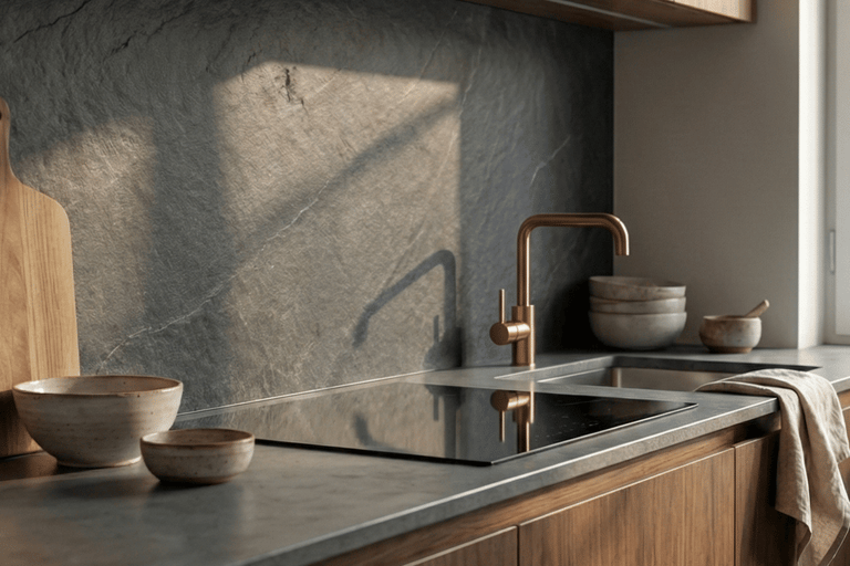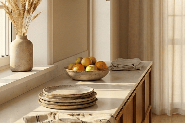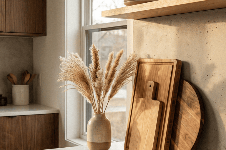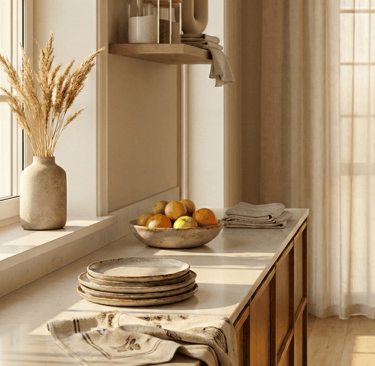 And remember: you don’t need to change everything — small pieces like linen towels, wooden trays, candles, glass vases and soft stools can completely transform your kitchen.