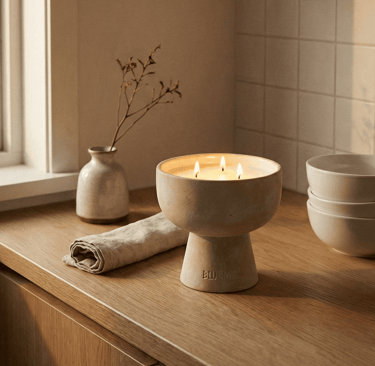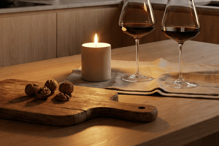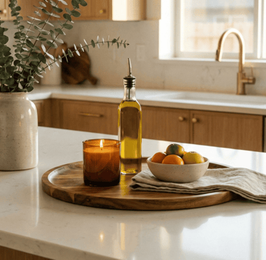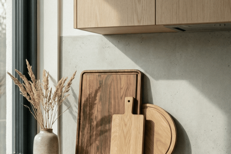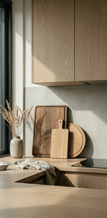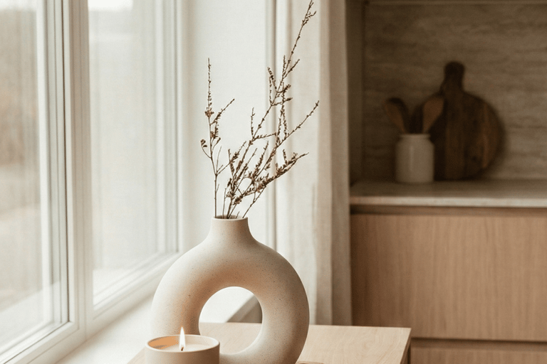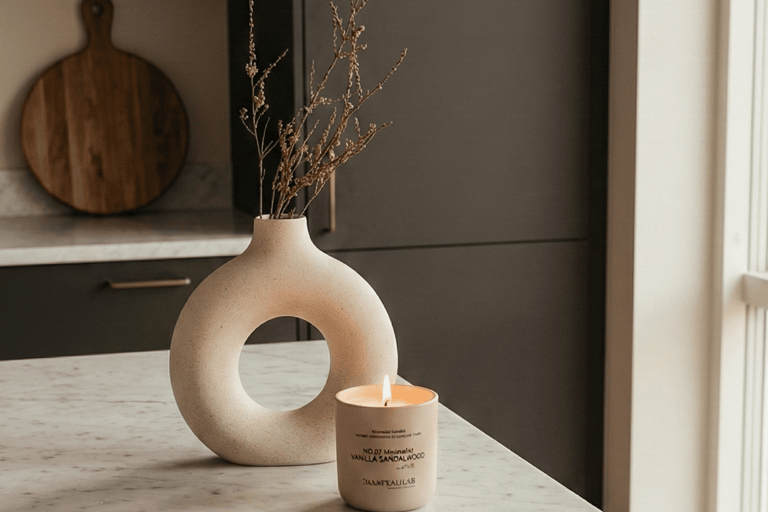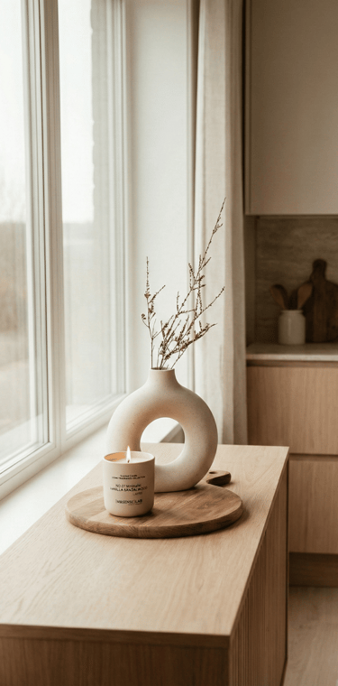 Style a small candle, a minimal vase, and a wooden cutting board together as a calm, intentional decor trio.