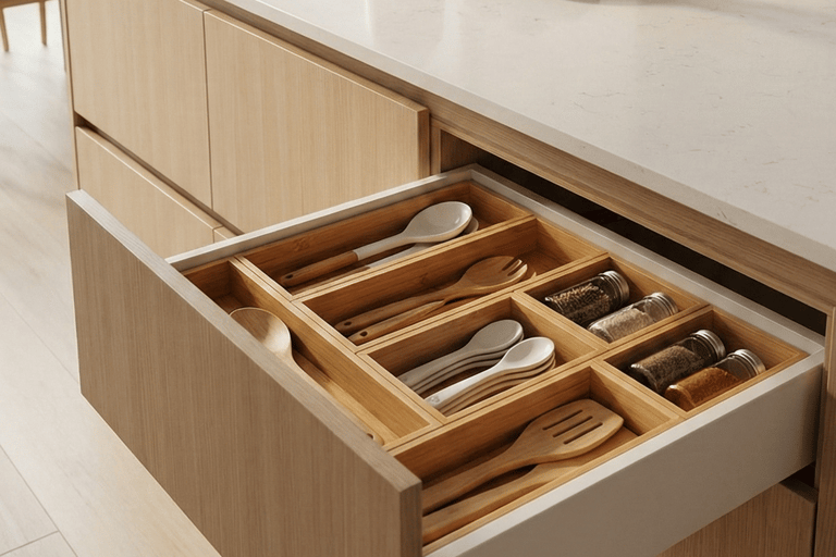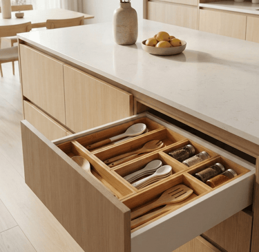 Add matte black handles, natural wood organizers, and a minimal table lamp on the counter to enhance the clean lines.