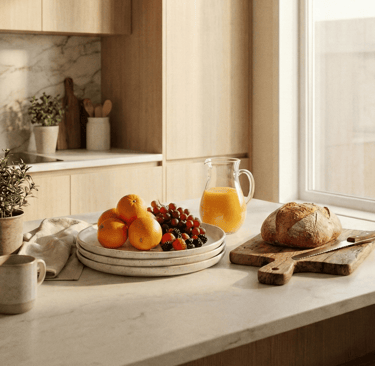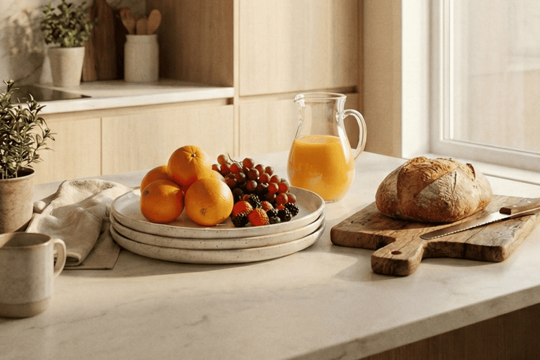 A simple layout of fruits, juice, and bread gives the kitchen a lived-in yet clean atmosphere.