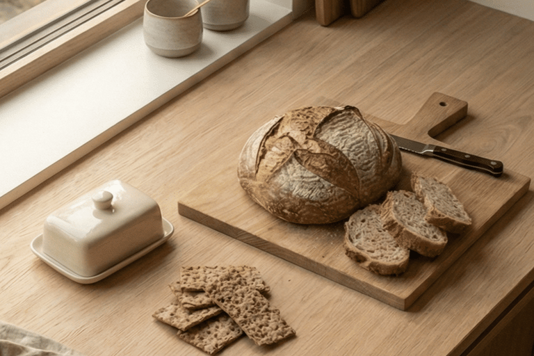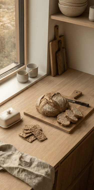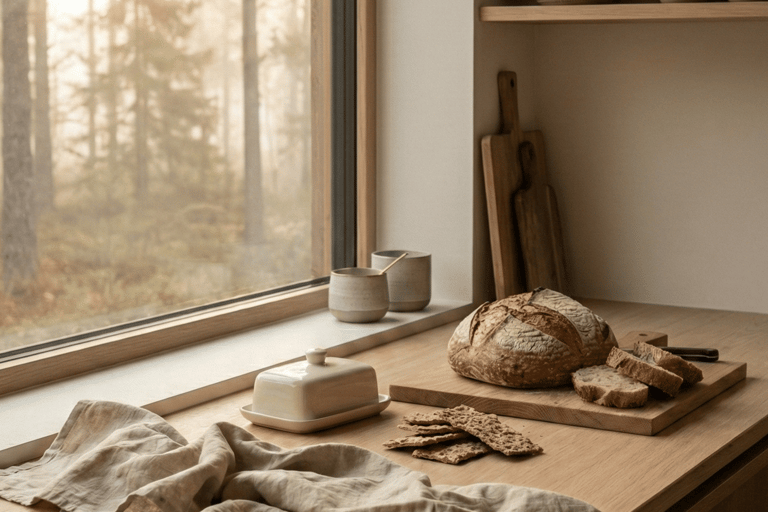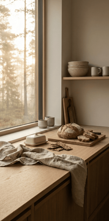 The combination of soft textiles and rustic bread adds an “everyday luxury” feeling — very Scandinavian.