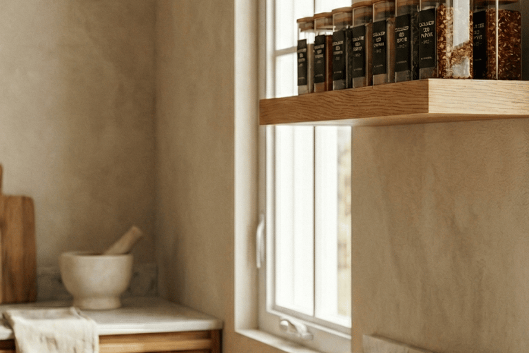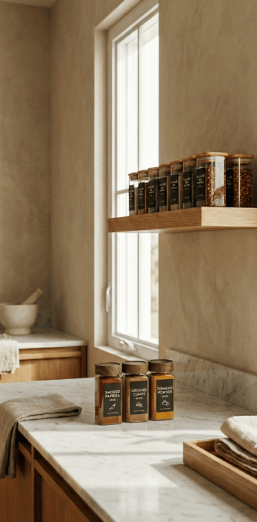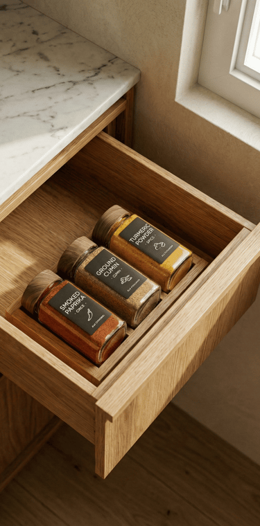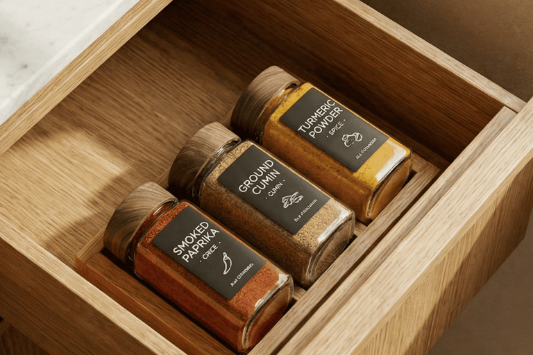 Use small glass spice jars with bamboo lids for a minimal and aesthetic storage upgrade.