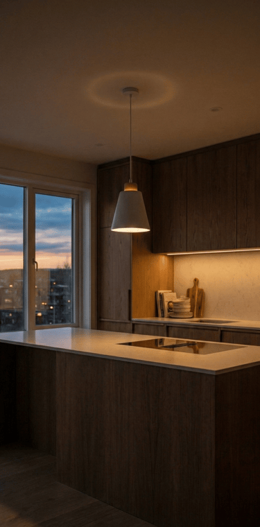 Scandinavian kitchens are known for their warm evening atmosphere — soft candles and dimmed lighting.
