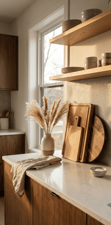 Wooden trays help organize small decor pieces and make the kitchen feel intentional.