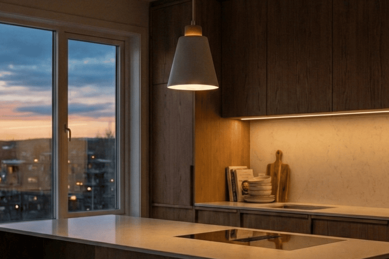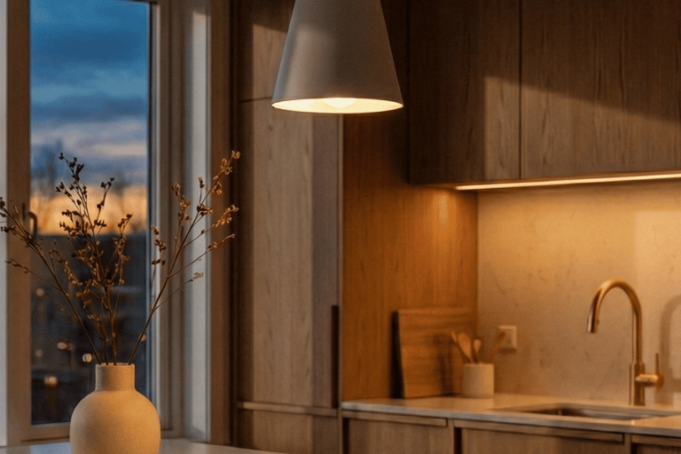A simple Scandinavian pendant with a matte white shade creates a calm, modern focal point.