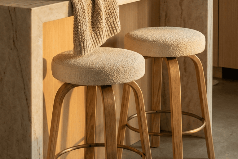 Soft, cushioned bar stools in warm neutral tones add comfort without breaking the minimal aesthetic.